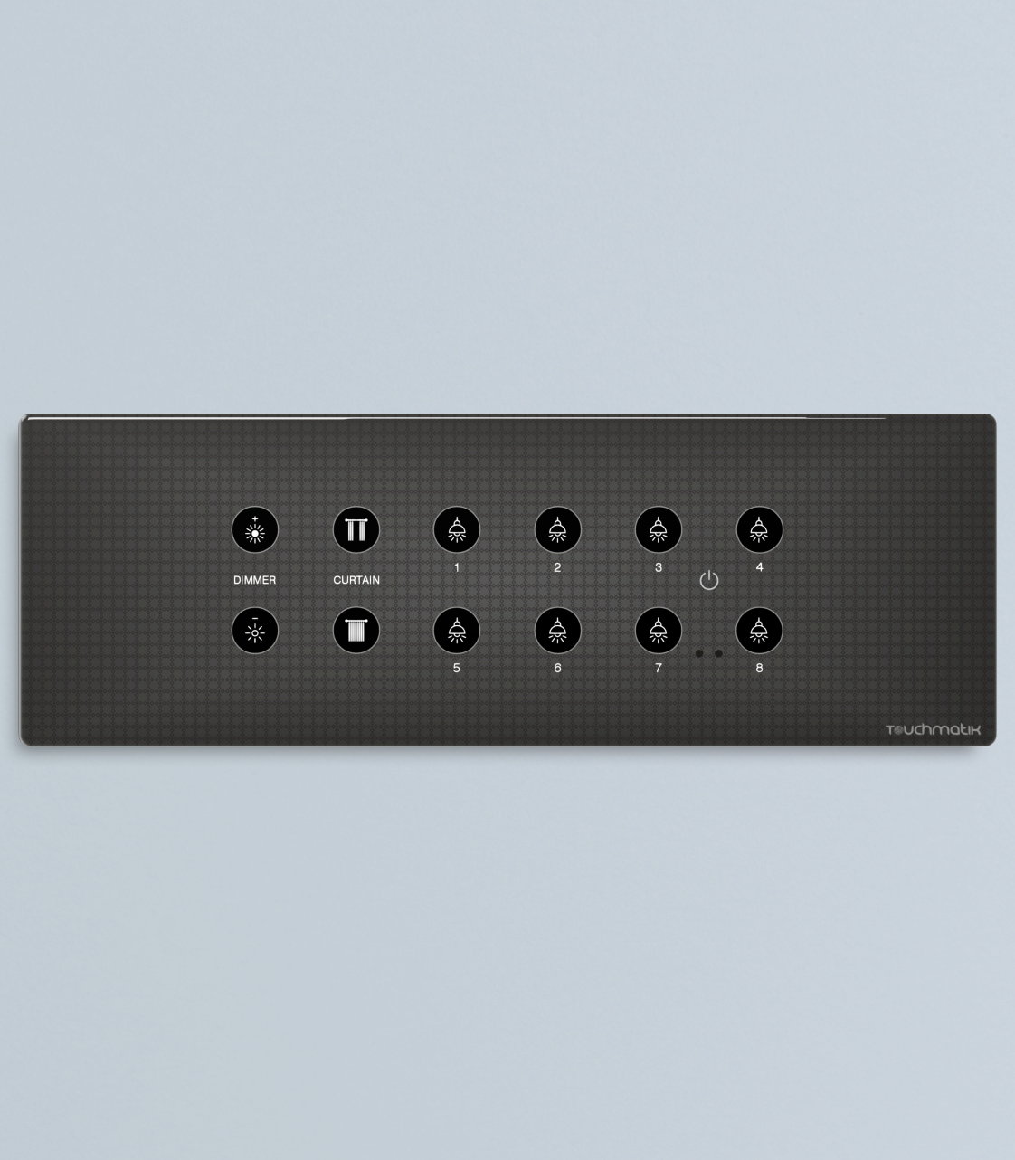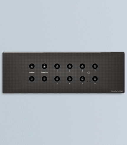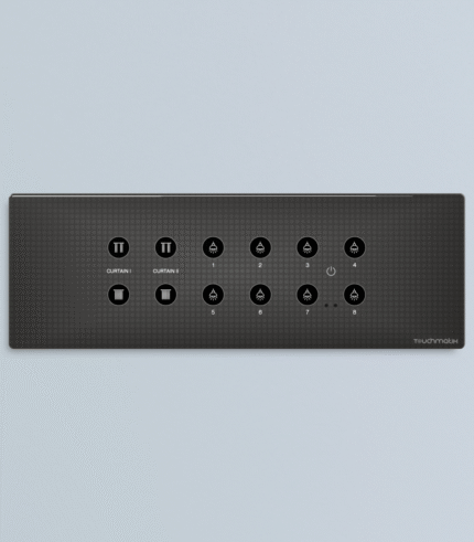 The design supports simple lighting, dimmer and curtain functions with stable output response. Input channels allow flexible use with sensors or mechanical switch. The touch layout has clear icons for dimmer, curtain, up, down, fan and nine switch points for direct access. The model suits rooms needing multiple switch, fan and curtain functions with IR controller support for added convenience.