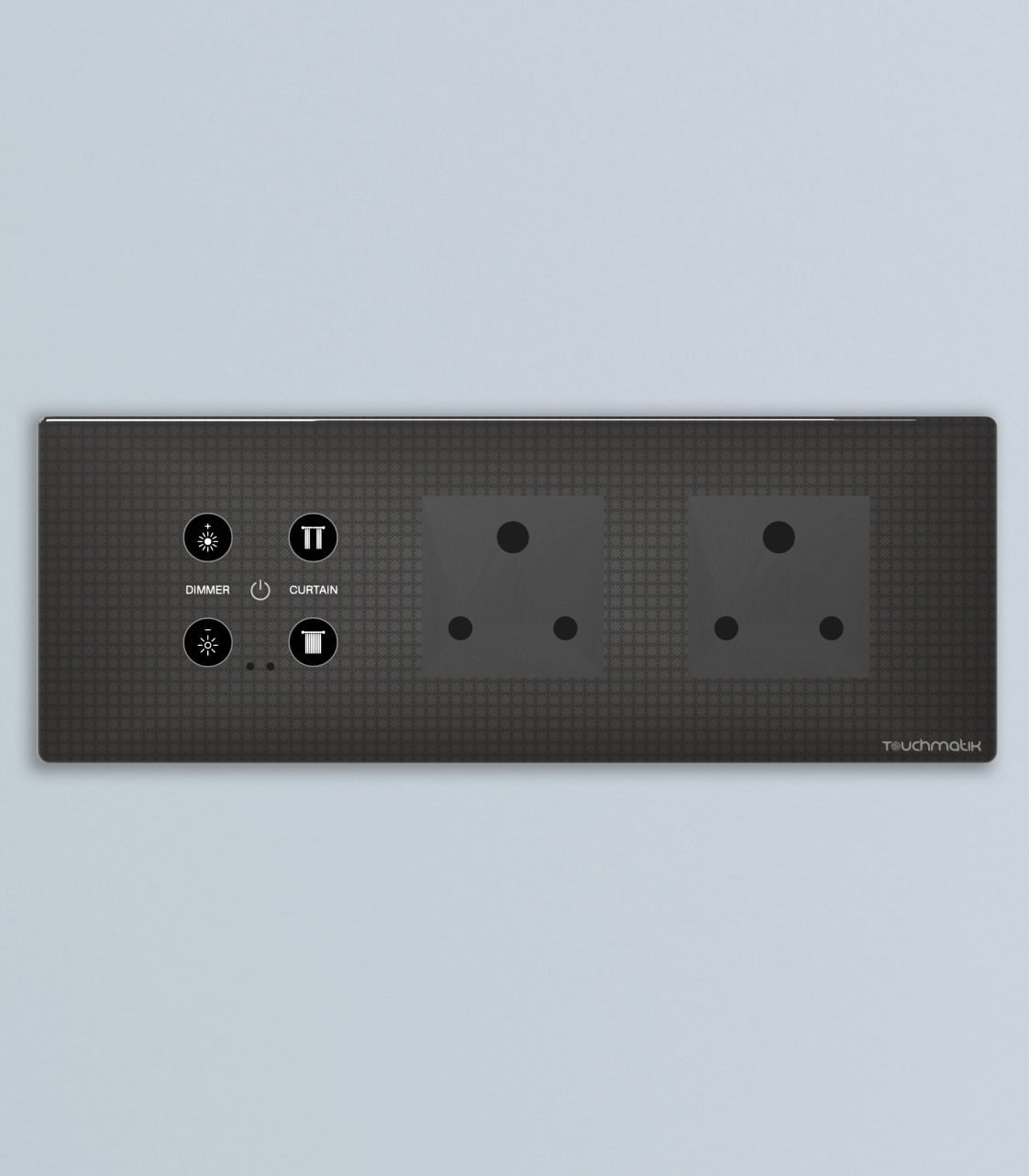 WiFi enabled mobile app based 2.4 Ghz control and RF remote support make the panel suitable for home and room use. The layout includes dimmer, curtain and two socket icons for clear control. The model gives stable output response for dimmable load, curtain and socket functions with simple use.
