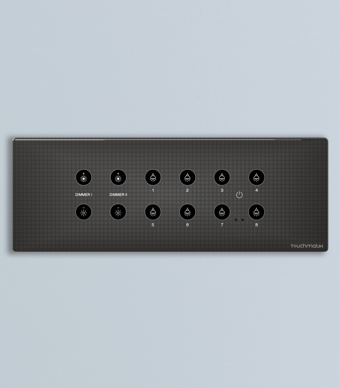 WiFi enabled mobile app based 2.4 Ghz control and RF remote support make the panel suitable for home and room functions. The layout includes dimmer I, dimmer II, eight switch icons and master key for clear touch use. The model gives stable output response suited for lighting control.